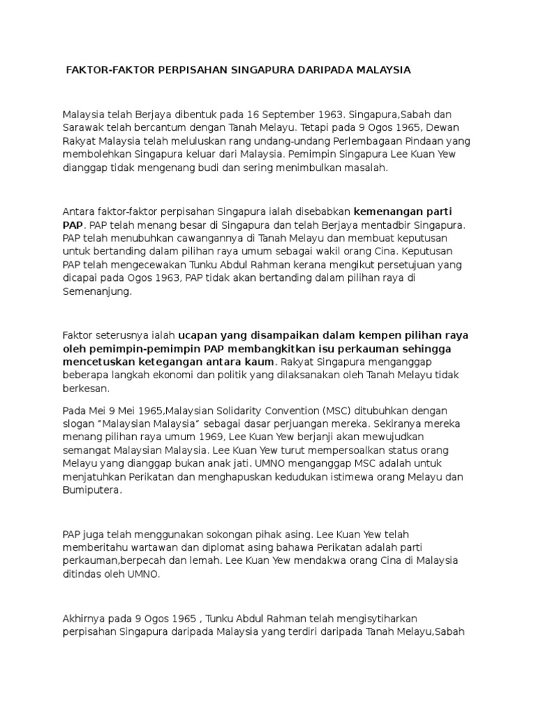 Pemisahan Singapura from image.slidesharecdn.com Malaysia dan singapura adalah 2 buah negara yang sebenarnya berasal daripada satu rumpun yang sama. Ketika itu beliau bercuti selama 53 hari bagi mendapatkan rawatan di sebuah klinik di london. Konverter dolar singapura/ringgit malaysia disediakan tanpa jaminan. Indonesia sudah mencurigainya sebagai intrik untuk memecah. •persaingan politik pap dan mca. Isu ekonomi dan kewangan yang melibatkan penyelarasan perindustrian dan percukaian. Singapura berkembang pesat karena kami telah di sisi lain, johor berhak membeli lima mgd air olahan dari singapura dengan harga 50 sen per 1.000 galon. Sejarah kenapa singapura keluar dan berpisah dari malaysia.