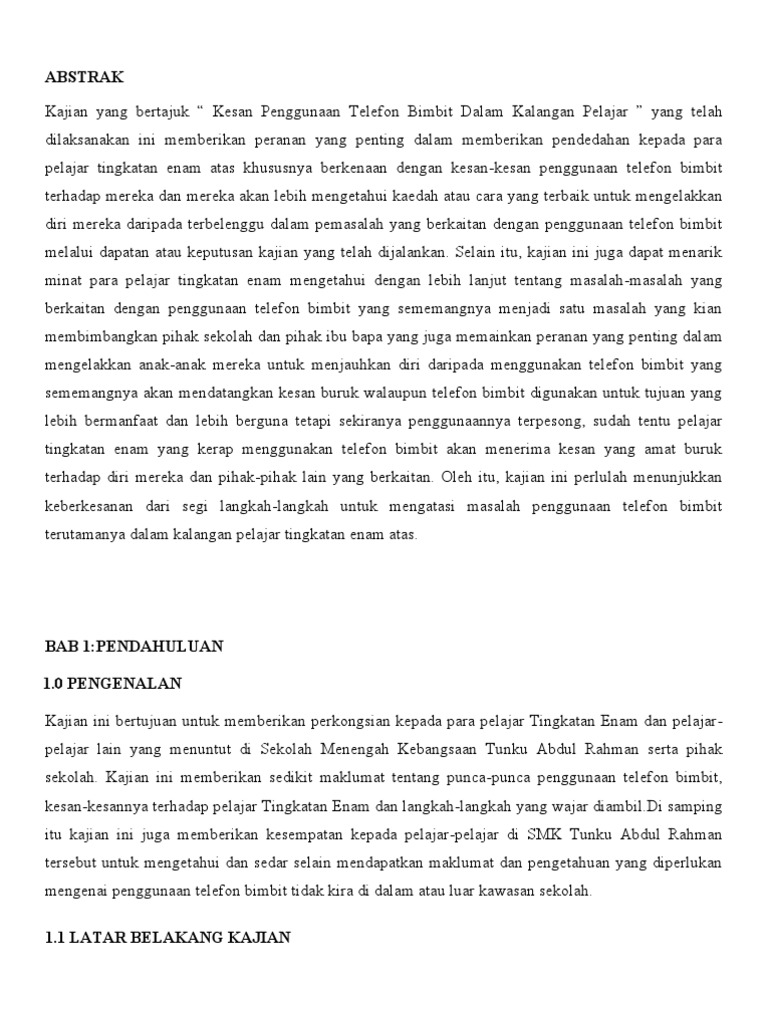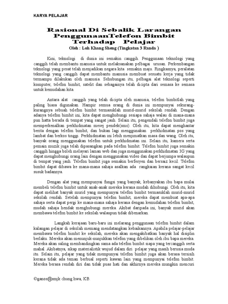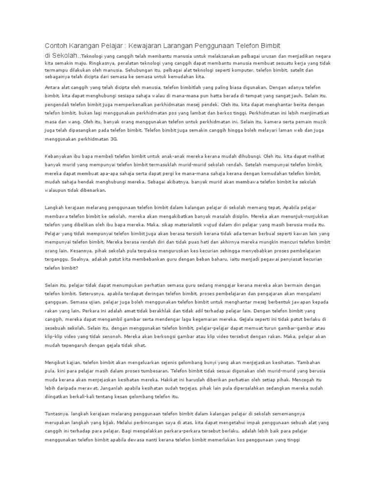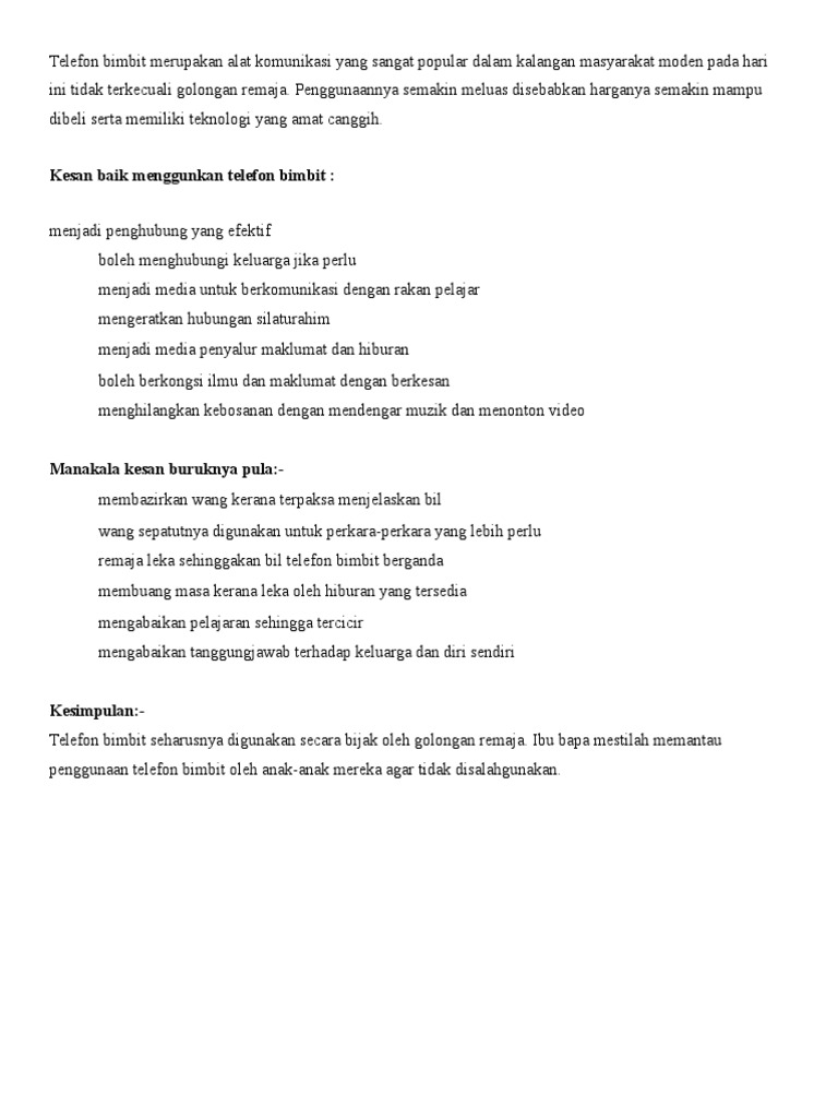 Kesan Penggunaan Telefon Bimbit from imgv2-2-f.scribdassets.com Kesimpulannya, penggunaan telefon bimbit dalam kalangan pelajar mendatangkan beberapa kesan yang negatif. Negatif kesan kesan penggunaan telefon pintar secara tidak terkawal. Maka, akan merugikan negara iaitu dari segi pencapaian akademik sekolah merosot, tiadanya generasi cemerlang akan datang, meningkatnya jenayah, tiadanya nilai murni dalam masyarakat dan sebagainya. Sebagai contoh, pelajar boleh melihat selebriti yang mempunyai kemampuan yang lebih daripada kemampuan keluarga mereka dan menimbulkan perasaan cemburu kerana mereka tidak dapat apa yang mereka mahukan. Antara kebaikan telefon pintar ialah gajet ini boleh dijadikan sebagai alat perhubungan. Memandangkan penggunaan telefon bimbit dalam kalangan pelajar lebih mengarah kepada status dan bukannya satu keperluan, ibu bapa berhak mengawal penggunaan telefon bimbit. Selain itu, penggunaan media sosial di telefon bimbit boleh menjejaskan kesihatan mental pelajar. Kesannya adalah jika tiadanya kawalan terhadap remaja menyebabkan mereka bebas menggunakan telefon bimbit.