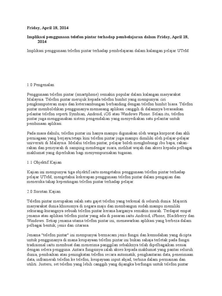 Implikasi Telefon Pintar from imgv2-1-f.scribdassets.com Untuk memudahkan pelajar yang lain untuk mencari bahan. Kesimpulannya, penggunaan telefon bimbit dalam kalangan pelajar mendatangkan lebih banyak kesan buruk daripada kesan baik. Memandangkan penggunaan telefon bimbit dalam kalangan pelajar lebih mengarah kepada status dan bukannya satu keperluan, ibu bapa berhak mengawal penggunaan telefon bimbit. Kesimpulannya, penggunaan telefon bimbit dalam kalangan pelajar mendatangkan lebih banyak kesan buruk daripada kesan baik. Pelajar seyogianya memanfaatkan kebaikan dan mengelakkan keburukan penggunaan telefon bimbit kerana yang baik dijadikan teladan, yang buruk dijadikan sempadan. Isi seterusnya, penggunaan telefon bimbit di sekolah memeberi kesan kepada hubungan erat antara pelajar. Kajian mengenai kesan penggunaan telefon bimbit di kalangan pelajar. Tapi apa yang merisaukan ramai pihak sekarang ialah penggunaan telefon pintar dan gajet tanpa kawalan di kalanagan remaja terutamanya yang masih bersekolah.